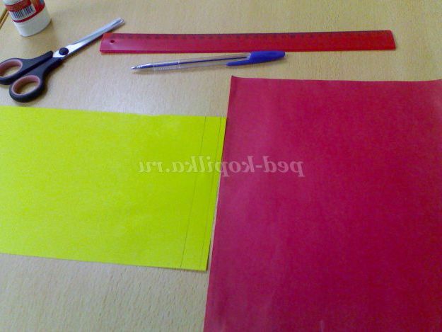 Беремо папір двох кольорів, я брала жовту - це буде серединка і червону - це будуть пелюстки айстри. Отмерям лінійкою 0,5см і 4,5см на червоному папері (розмір залежить від того яким буде квітка, великий або маленький) - це для пелюстки. На жовтій відміряємо 0,5см і 1,5см - це серцевинка.