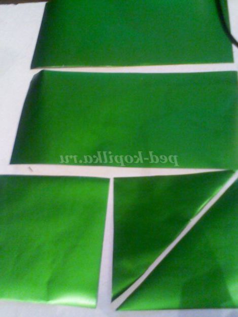 4. Далі будемо робити листочки. Беремо кольорову фольгу і розрізаємо її на три рівні частини. Потім кожну частину навпіл, повинен вийти квадрат. А квадрат розрізаємо по діагоналі.