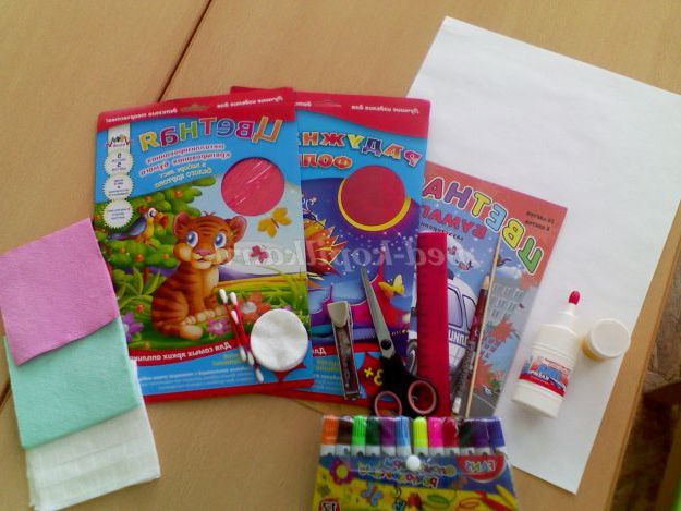 Аркуш А3, кольоровий папір,кольорова металізована крепований папір, райдужна фольга, білі і рожеві серветки, фломастери, степлер, лінійка , ножиці,олівець,ватяна паличка, ватяний диск, гуаш жовтого кольору, клей ПВА.