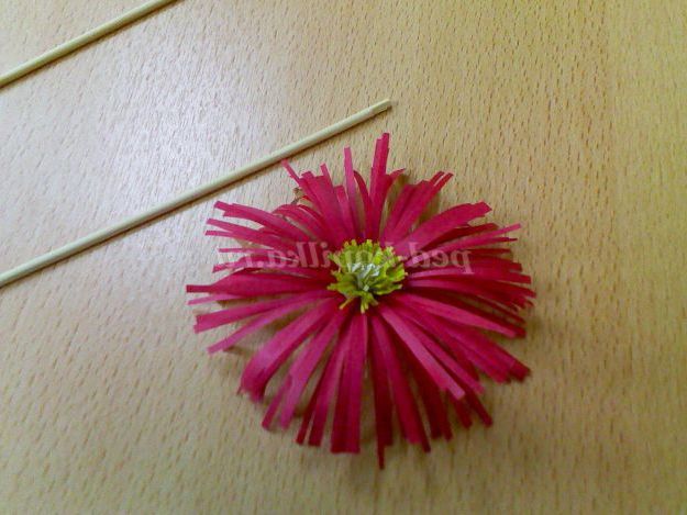 22. Знімаємо з зубочистки і вигинаємо бахрому червоного кольору, а серединку можна і не вигинати, а можна і теж вигнути. Астра готова.
