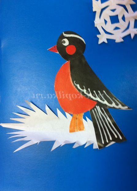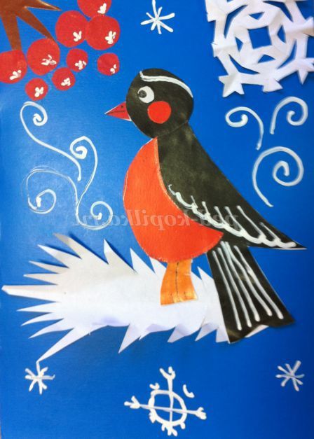 7. В додаток можна приклеїти сніжинку або намалювати її, в кутку аплікації можна зробити гілочку горобини (це можна зробити зі старшими класами поч. школи). (фото №6,7)