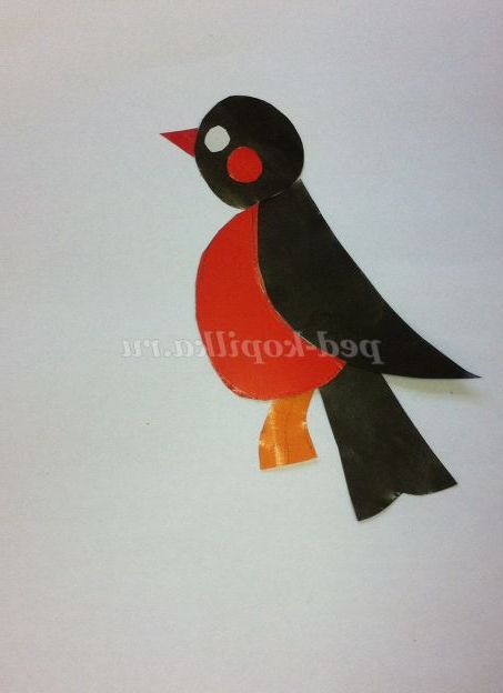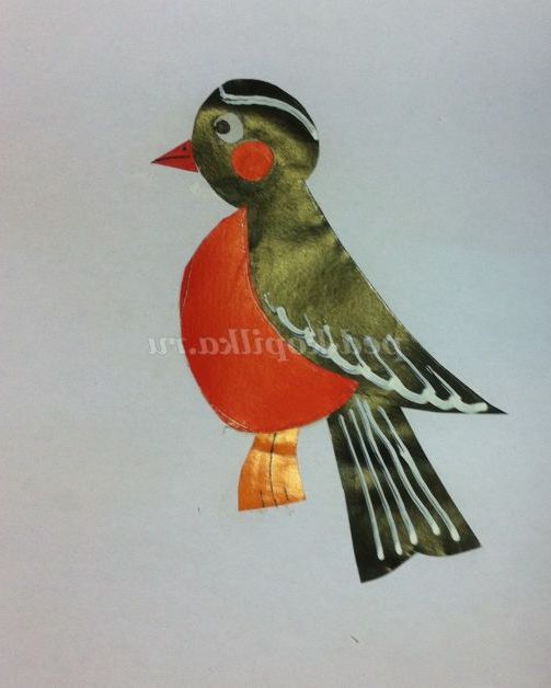3. Перед тим як робити аплікацію, я рекомендую на звичайному білому аркуші зібрати пташку (як мозаїку, після чого подивитися, чи правильно все розкладено) і потім наклеїти її на чистий білий аркуш (фото 2).