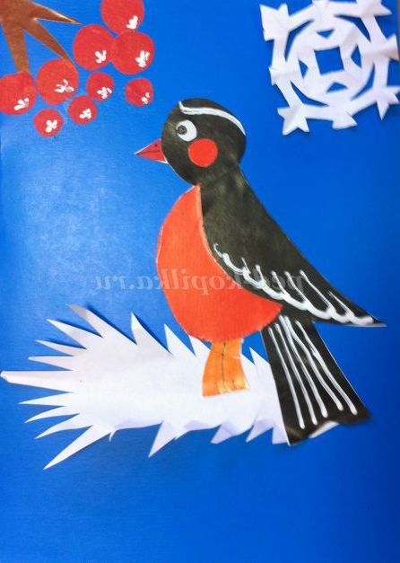 Зимова аплікація з кольорового паперу для дітей: Снігур взимку на гілці з горобиною