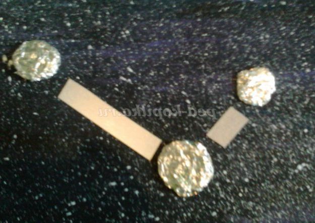 Крок 5. Обрано сузір'я, висохли всі шари фарби на ватмані, приготовані зірки-заготовки. Ми наклеюємо зірки на фон, створюючи за допомогою смужок світловідбиваючої стрічки «малюнок» сузір'їв. (На підсумковій роботі представлені Сузір'я Кита і Сузір'я Овна).