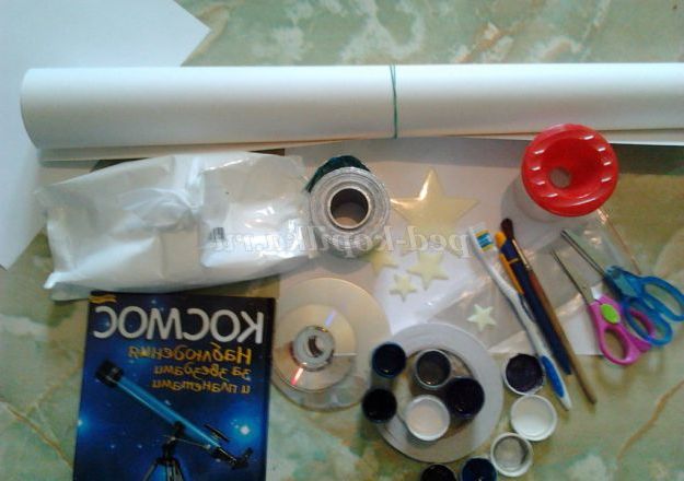 Підготовка. Нам знадобиться: ножиці (краще 2 шт., окремо для паперу і окремо для скотча); двосторонній скотч; гуаш (чорний, синій, фіолетовий, білий і сірі кольори); баночка для води; световозвращающяя стрічка; широка або середня кисть; зубна щітка; аркуш формату А1 або А2; DVD-диски; флуоресцентні зірки; фольга. Матеріали та інструменти для творчості можна придбати в магазинах канцтоварів і тканин і фурнітури. Також ми будемо просити батьків дітей принести «сміття» (акцентуючи на цьому увагу дітей): DVD-диски, зубні щітки, фольгу від шоколадок, шматок шпалер (ними можна замінити ватман). Крім цього для нас актуальні енциклопедії та книги про космос. Вологі серветки також зайвими не будуть.