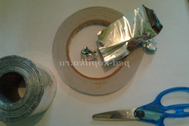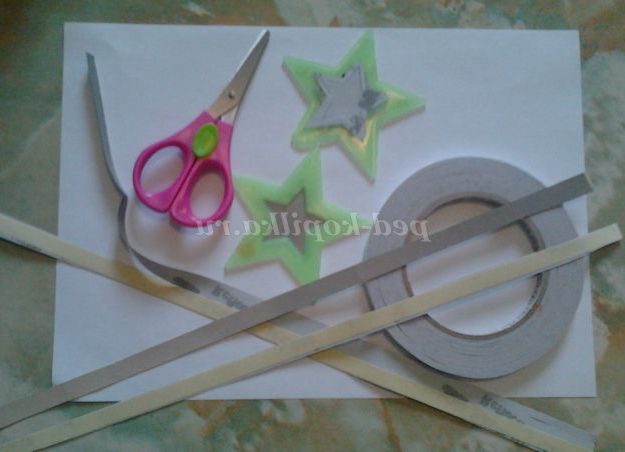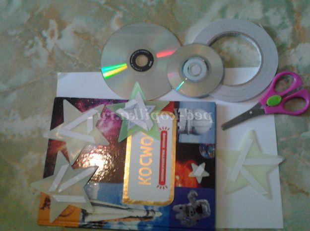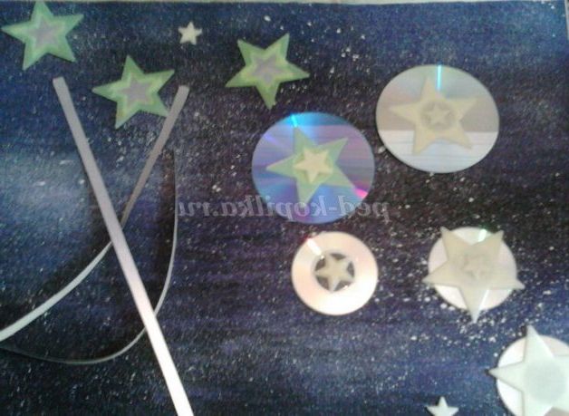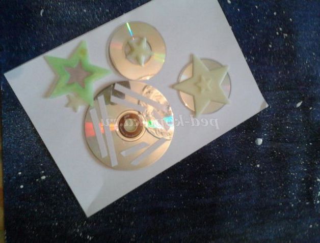 Крок 2. Поки сохне фон, ми зробимо заготовки для зірок. Для цього нам потрібно за допомогою двостороннього скотчу приклеїти флуоресцентні зірки до DVD-дисків. Самі зірки можна фарбувати шматочками світловідбиваючої стрічки (вона також легко приклеюється з допомогою двостороннього скотча). До звороті дисків і световозращающей стрічці, попередньо розрізаної на смужки, ми аналогічним чином приклеюємо двосторонній скотч. Крім цього, ми можемо створювати зірки з щільних кульок з фольги.