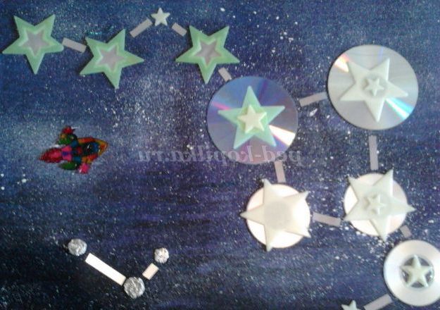 Призначення роботи: прикрасити приміщення до Дня космонавтики. Зірки будуть видні при будь-якому освітленні, так як диски і світлоповертаюча стрічка відображають/заломлюють промені світла, а флуоресцентні зірки світять навіть в темному приміщенні.
