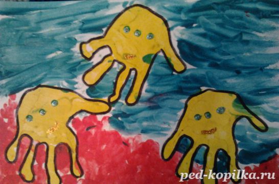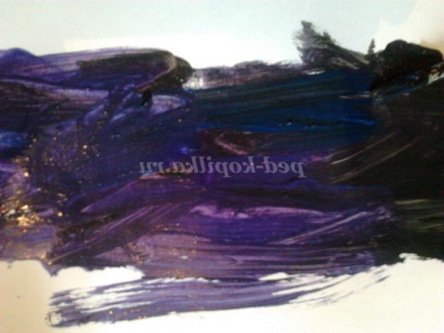 Крок 1. За допомогою кисті зафарбовуємо аркуш паперу. Використовуємо чорну, синю і фіолетову фарбу. Якщо заняття проводиться для декількох дітей, кожна дитина може взяти пензель і баночку з фарбою і зафарбовувати певний ділянку ватману (малюки раннього віку можуть малювати пальчиками). Ми малюємо густою фарбою, одночасно роблячи вертикальні мазки всіма кольорами. Коли фарба підсохне, перед нами буде різнобарвне нічне небо.