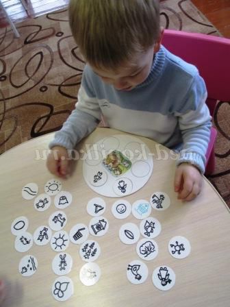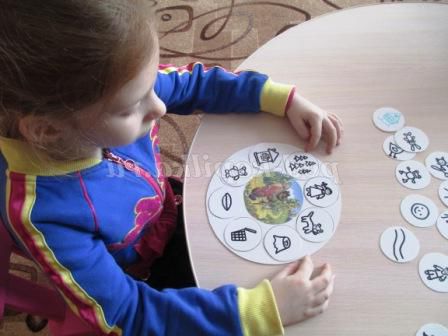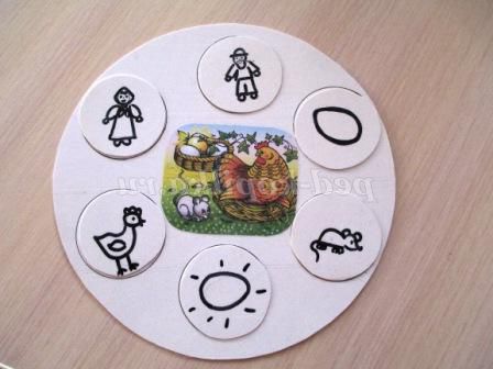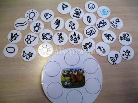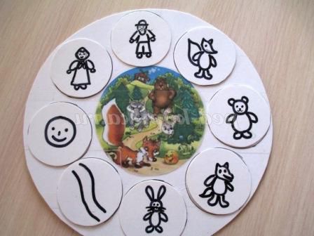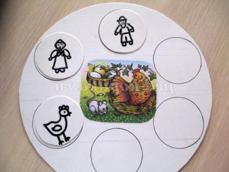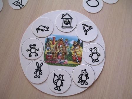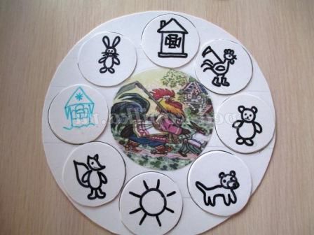 Гра являє собою карти круглої форми, в центрі яких розташовані картинки із зображенням сюжету знайомих дітям казок, по колу від картинки знаходяться комірки для викладання карток-схем із зображенням героїв казок.