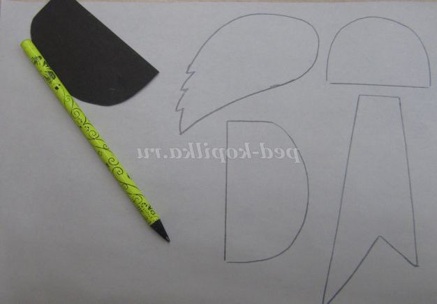На папері чорного кольору розміщуємо шаблони голови птаха, хвіст, крила і спинки. Обводимо і вирізаємо.