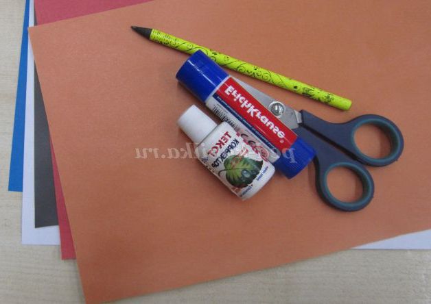 Необхідні матеріали та інструменти: аркуш кольорового картону (для основи), кольоровий папір (можна використовувати папір для ксерокса), клей, пензлик, ножиці прості фігурні дироколи.