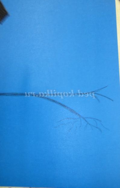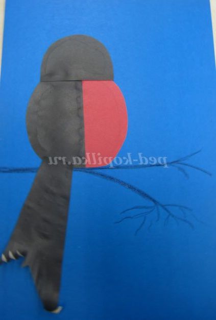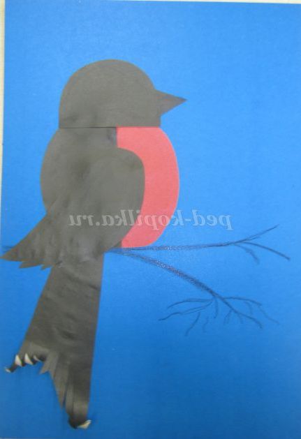 На гілку «садимо» приклеюємо грудку червоного кольору і спинку чорного кольору.