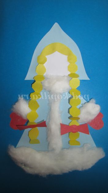 Смужки жовтого кольору складаємо гармошкою, обрізаємо краю з чотирьох сторін і наклеюємо кіски волосся. Потім наклеюємо бантики.