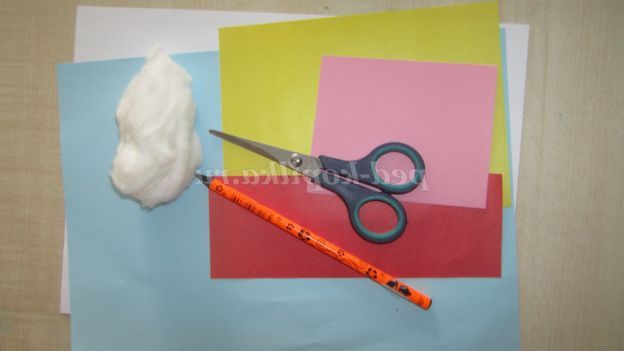 Необхідні матеріали та інструменти: аркуш кольорового картону (для основи), кольоровий папір (можна використовувати папір для ксерокса), вата, клей ПВА, пензлик, ножиці, дирокол фігурний.