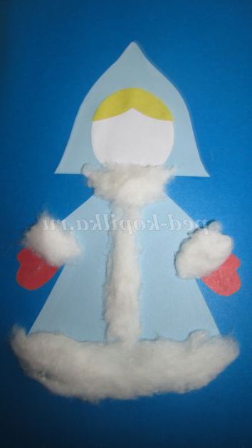 Домальовували або приклеюємо очі, щоки, рот. Білою гуашшю малюємо снігові пластівці і сніг, або наклеюємо.