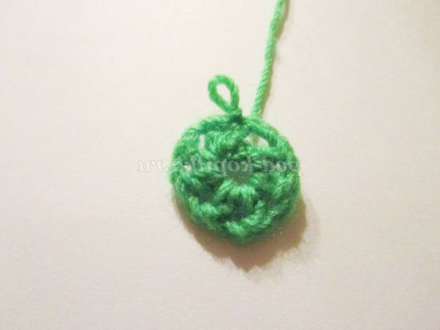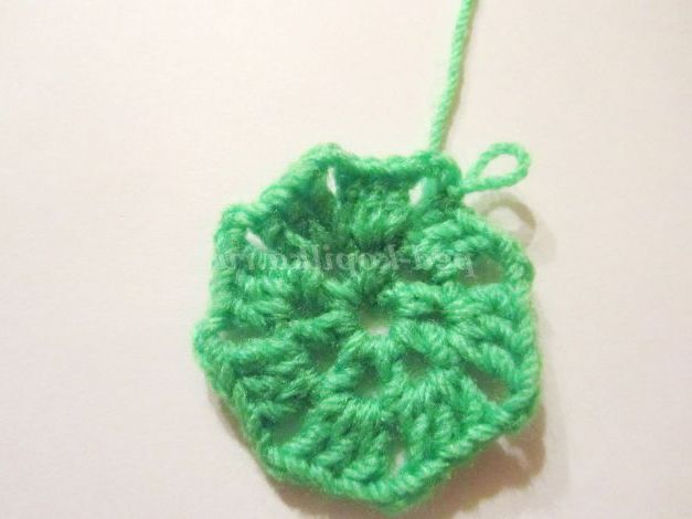 Три повітряні петлі і два стовпчики з накидом, пров'язуємо разом. Дві повітряні петлі і три стовпчики з накидом, дві повітряні петлі і три солбика з накидом, дві повітряні петлі і три солбика з накидом, дві повітряні петлі і три солбика з накидом, дві повітряні петлі і три солбика з накидом, дві повітряні петлі і три солбика з накидом, дві повітряні петлі і три солбика з накидом, дві повітряні петлі з'єднуємо з початком.