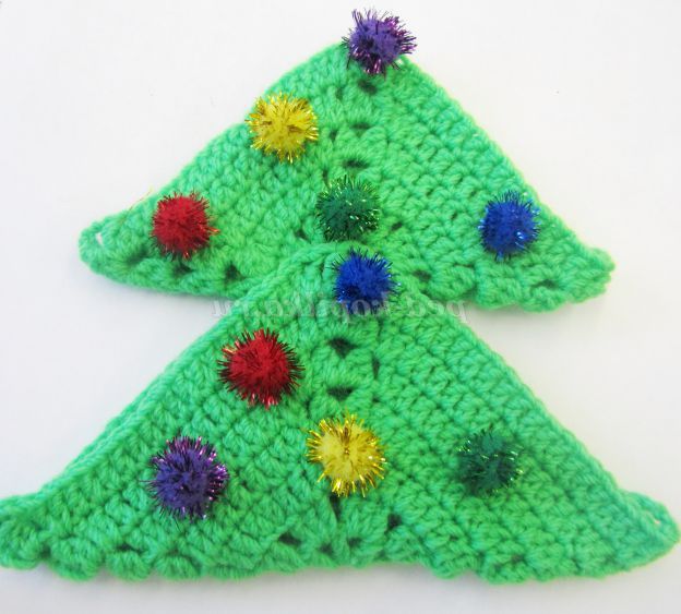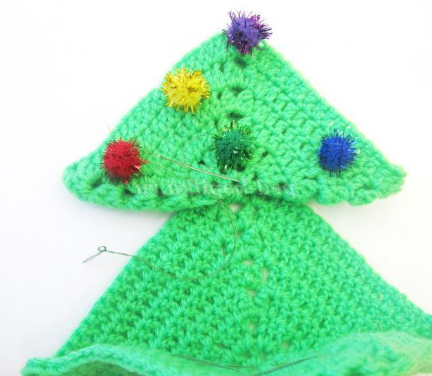 Потім помпончики пришиваємо до другого і третього квадратика. Закріплюємо верхівки.