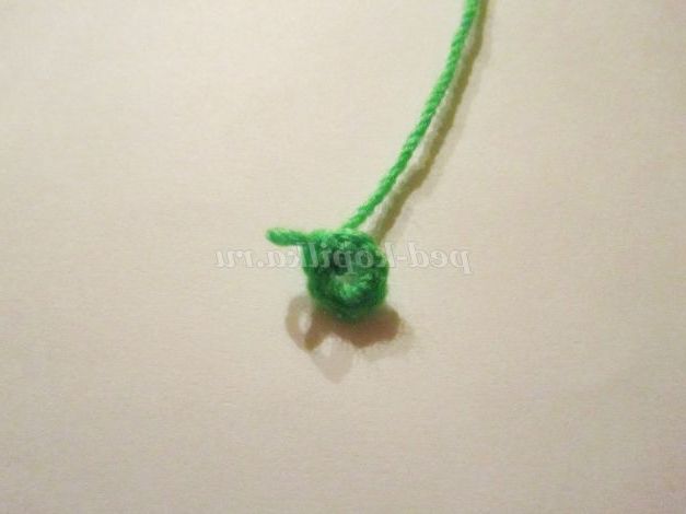 Набираємо 4 повітряні петлі, стовпчик з накидом, повітряна петля, стовпчик з накидом, повітряна петля, стовпчик з накидом, повітряна петля, стовпчик з накидом, повітряна петля, стовпчик з накидом, повітряна петля, стовпчик з накидом, повітряна петля, стовпчик з накидом, дві повітряних петель з'єднуємо з початком.