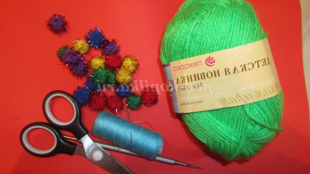Вовняні нитки для в'язання, гачок, нитки з голкою, ножиці, помпончики.