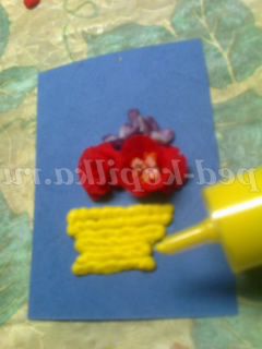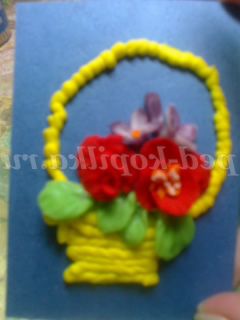 Такими квітами можна оформити вітальну листівку. Наприклад, кошик намалюємо фломастерами, а наповнимо її нашими квітами. Приклеюємо їх клеєм ПВА. Тримаються чудово.