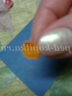 В серединку квітки покладемо жовту або помаранчеву крихітну горошинку і з допомогою зубочистки зробимо невеликі цяточки - вм'ятинки: