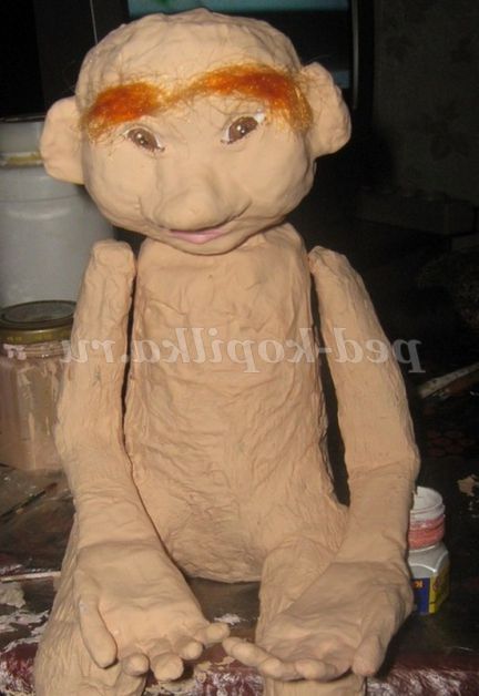 Фото №19: потім ще 2 рази пофарбувати акриловою фарбою, другий шар повинен бути тілесного кольору, потім промалювати очі, губи, наклеїти брови, вуса, бороду і волосся. Прикріпити руки до тулуба так, щоб можна було при необхідності поміняти позу (я прикріпила з допомогою довгого самореза)