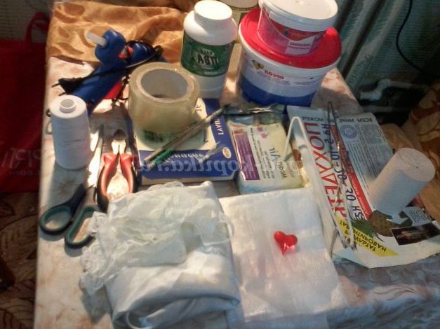 1. Для роботи приготувати дріт, ножиці, кусачки, клейовий пістолет, газети і туалетний папір, шпаклівку, білу акрилову фарбу, гуаш, клей ПВА, пензлик, скотч, декоративне сердечко, штучні волосся, білу нитку і голку, полімерний матеріал (їм упаковують апаратуру), білу тканину, мереживо.