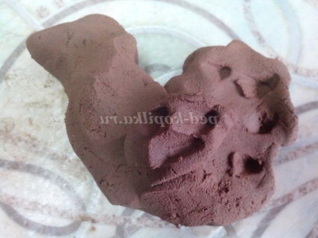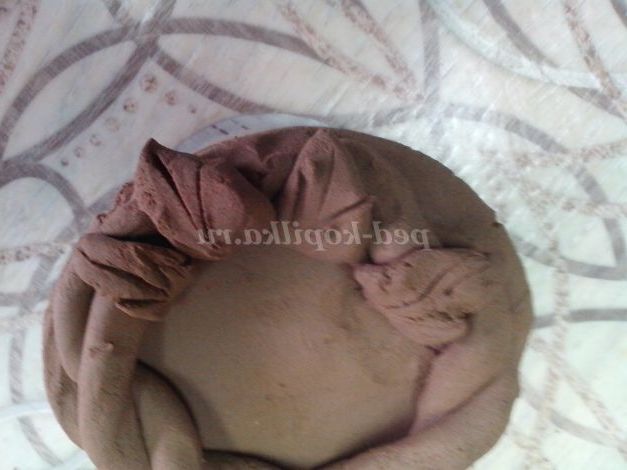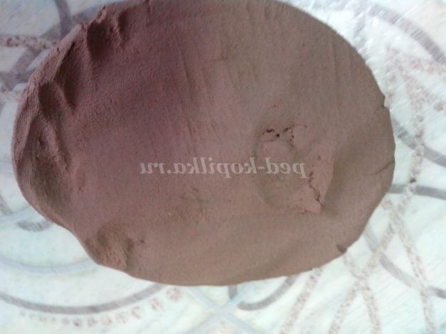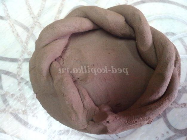 Хлопці, подивіться, ви візьмете шматки глини, і розділити їх на частини.( Діти скачують велику товсту ковбаску «лам-лам ділимо глину навпіл», так само ділиться ще раз друга частина глиняної ковбаски). З великого шматка глини куля скочується і розплющується між мокрою ганчіркою прийомом «карате», вийшла основа для гнізда (корж товщиною 1 см).