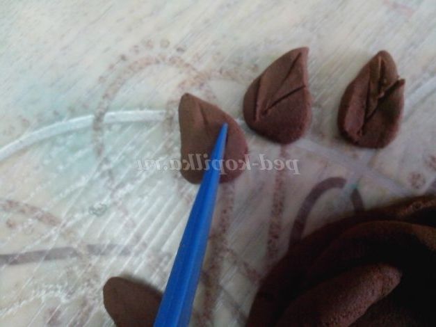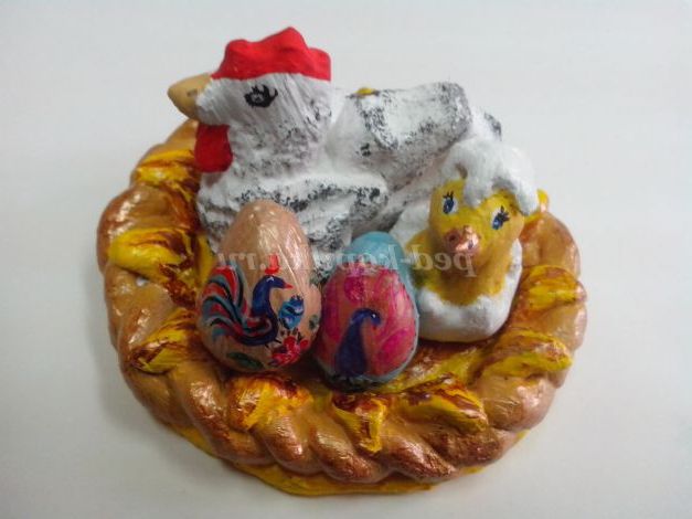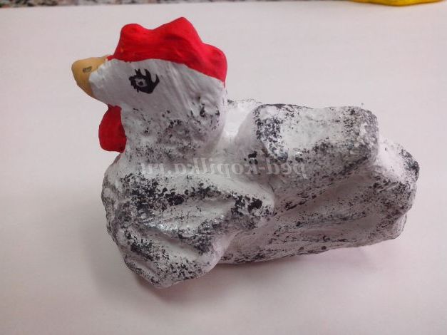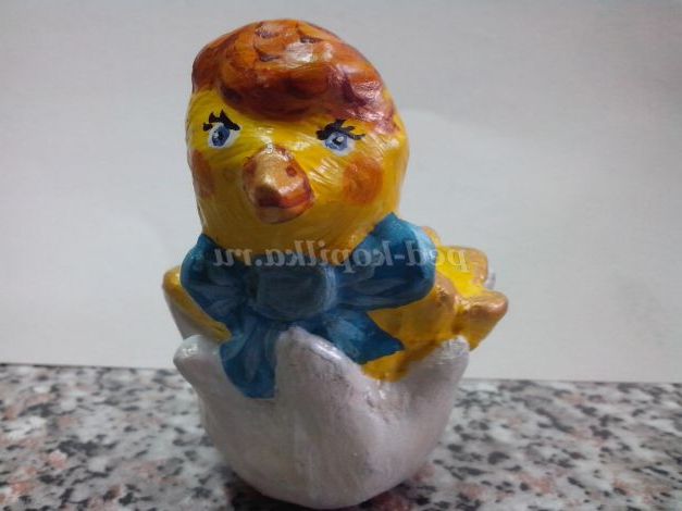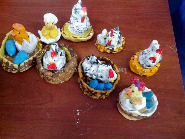Тепер круговими рухами скачуємо яйця, формуємо їх однакові за величиною. В одному з яєць вставляємо курчати зліпленого з кульок з відтягнутим дзьобом, зверху на головку примазывается шкарлупка, виконана з шматочка глини. Ліпимо курку з морквин. Одна велика морква, формуємо з неї тулуб, голову прищипнув гребінець, відтягнувши дзьоб, шляхом згинання та розплющення хвоста. З кульки сплющенням виконуємо підставку, примазываем її. Пір'я зображуємо за допомогою заточеною палички, завдаючи ритмічні вдавлення по крил і хвоста.