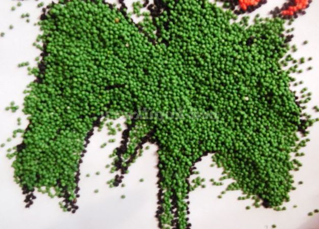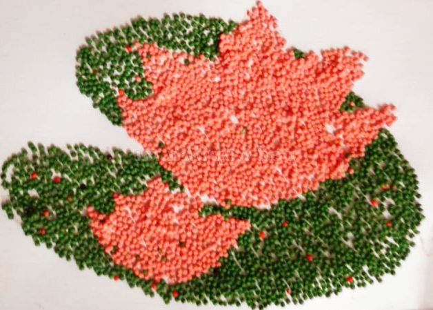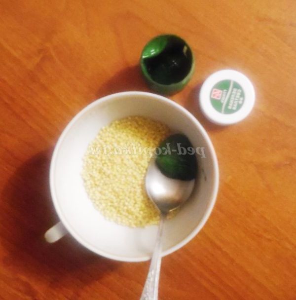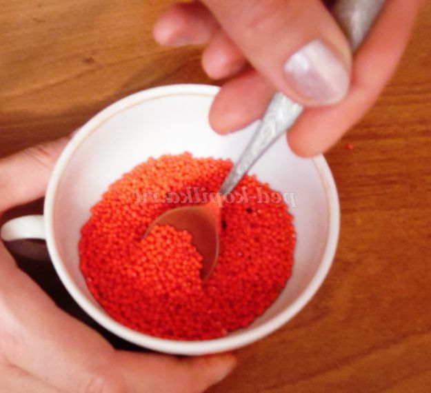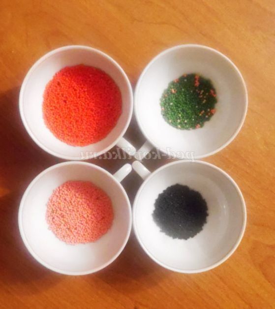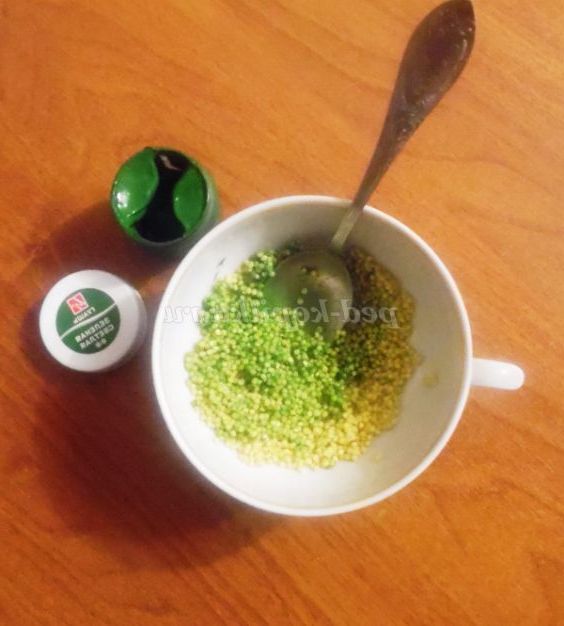 У нашому випадку малюнок виконаний в 4 кольорах: зеленому, чорному, червоному і рожевому. Фарбувати пшоно будемо звичайною гуашшю. Для цього набираємо в чайну ложку трохи фарби і починаємо інтенсивно перемішувати її з крупою.