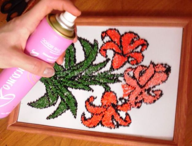 Після виконання роботи, коли вона зовсім висохне, картину потрібно покрити лаком або тонким шаром прозорого клею. Це додасть картині блиск і не дасть довгий час обсипатися.