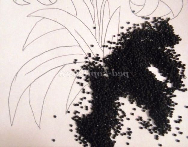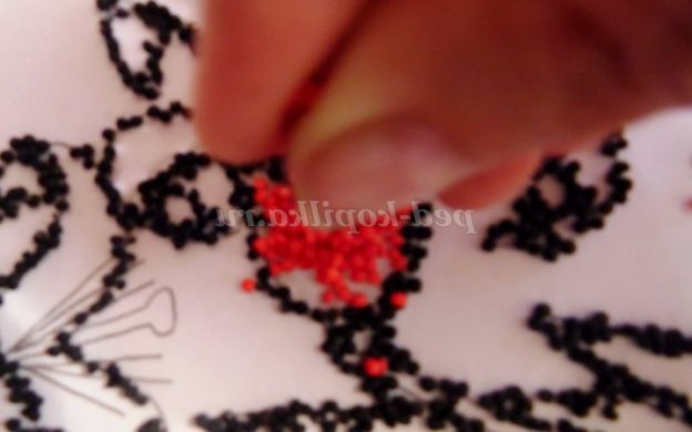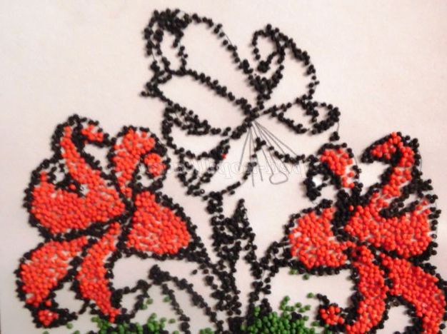 Насипаємо крупу чорного кольору на контур малюнка, промазанный клеєм. Залишаємо трохи підсохнути, щоб вона міцно прилипла до картону.