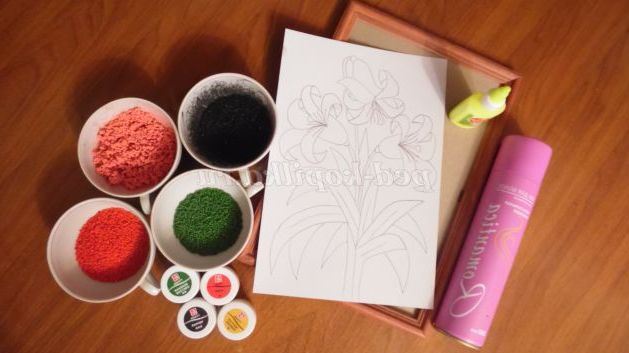 Для роботи необхідно: щільний картон (за бажанням кольоровий), клей ПВА, пшоняна крупа, гуаш, пензлі, ємності для крупи, лак для волосся.