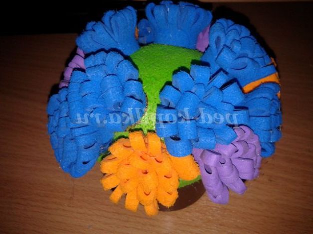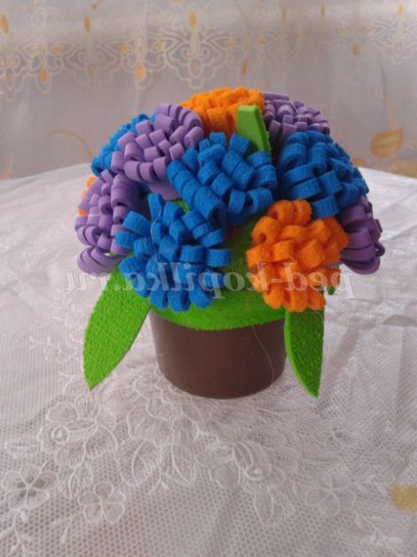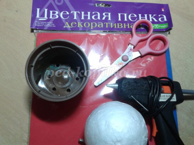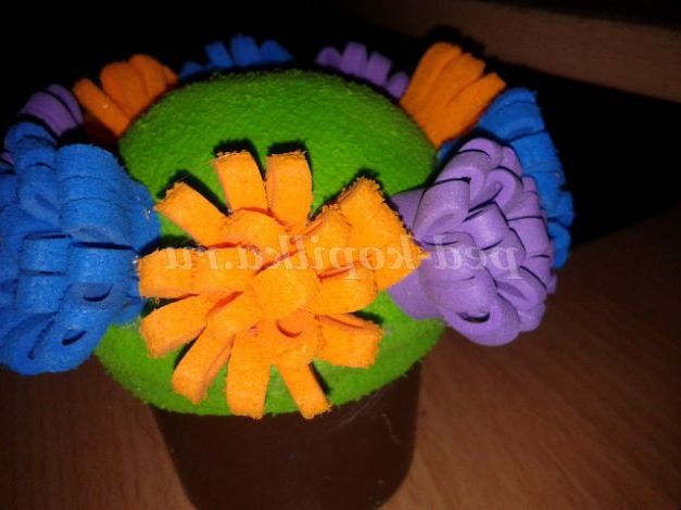 Матеріали: фоамиран (спінена гума)зеленого, оранжевого, синього та бузкового кольорів, клей - пістолет, ножиці, олівець, пінопластовий шар d=7 см, квітковий горщик.