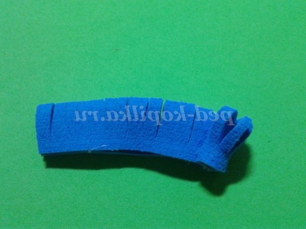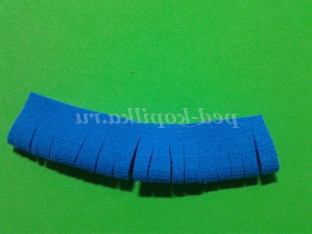 Виріжемо з обраних кольорів фоамирана смужки 8*4 див. За допомогою клею - пістолета склеим їх навпіл в довжину і наріжемо "травичкою" не дорізуючи до кінця заготовки.