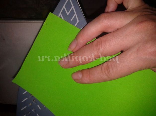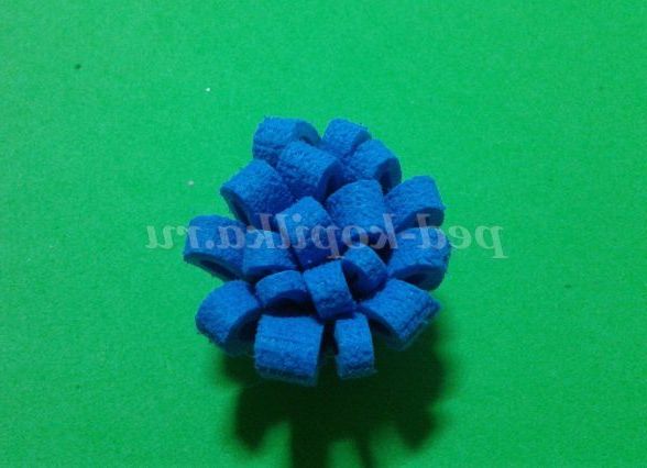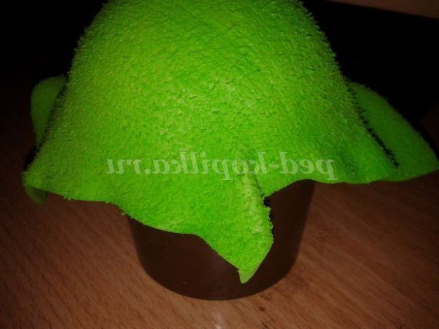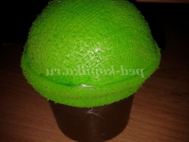 Зелений фоамиран докладемо до праски(110°С) на кілька секунд і натягнемо на шар.Благодаря своїм властивостям розтягування фоамиран приймає форму полушара.Обрезаем зайве і приклеюємо отриману заготовку за допомогою клею-пістолета.