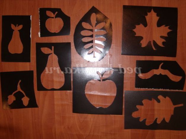- трафарети з осінніми листочками (вирізані заздалегідь педагогом з картону),