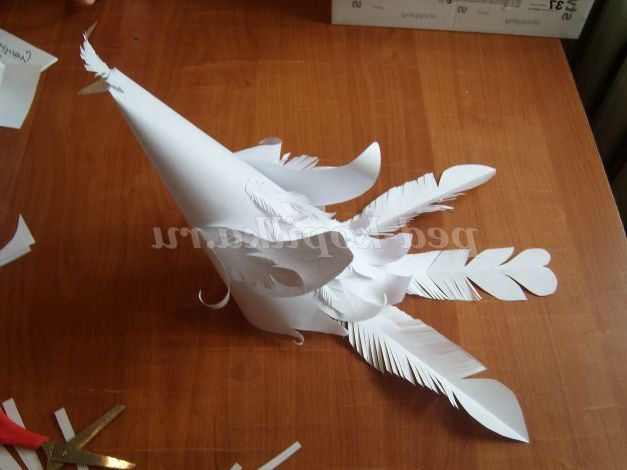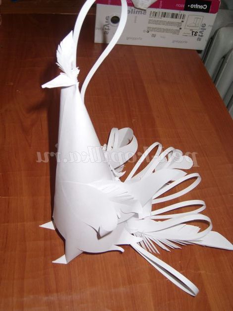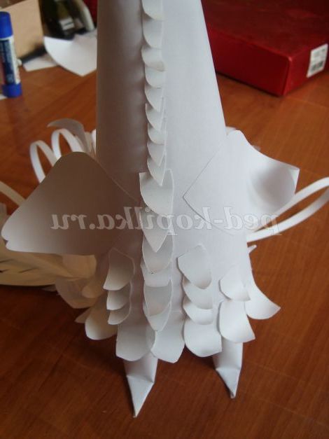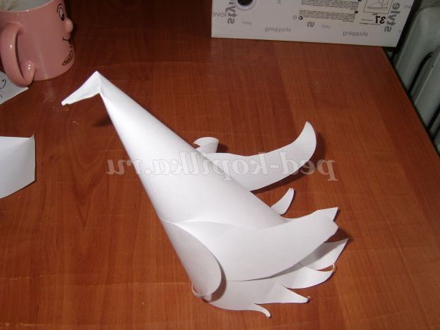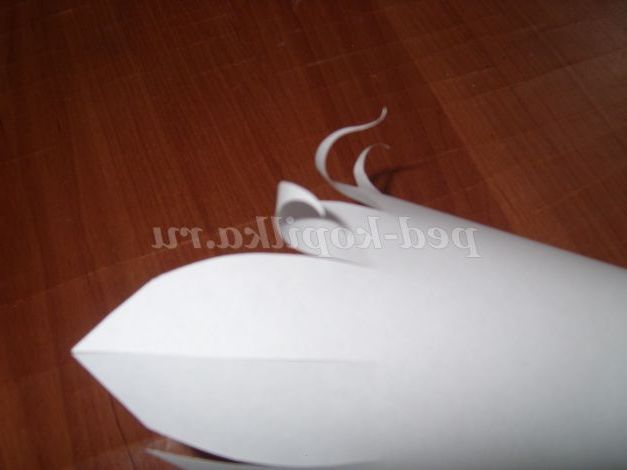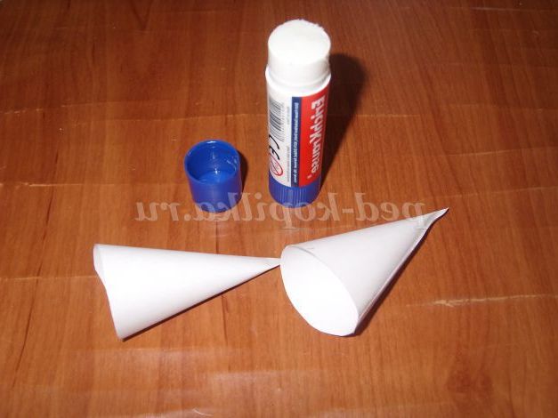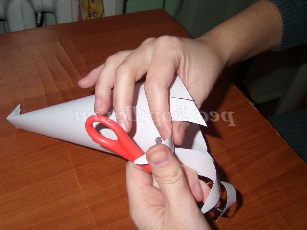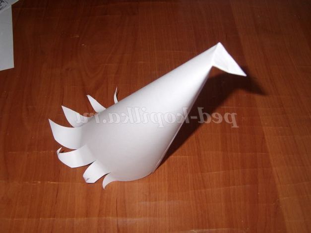 1. З листа А4 звертаємо конус і склеюємо. Відрізаємо зайве. Зверху загинаємо дзьобик.