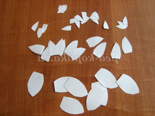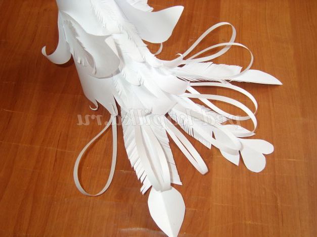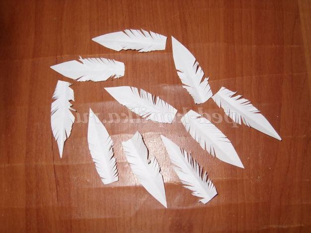 12. Зі смужок різної ширини, вирізаємо маленькі пір'їнки.