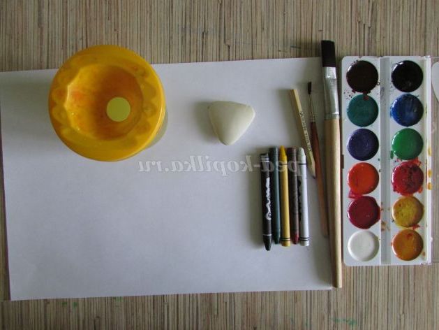 Акварель, альбомний аркуш (для дітей половина аркуша), пензлі різного розміру, воскові крейди, банку з водою, простий олівець, стерка.