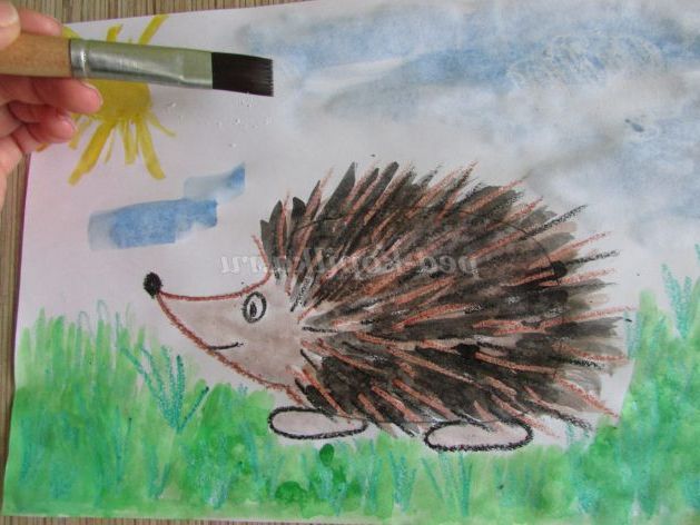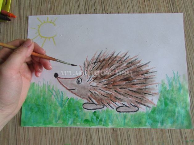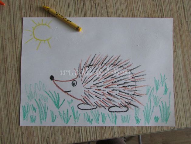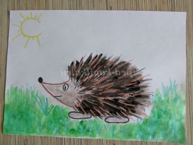 4.Обвести чорним восковим дрібному очей, ніжки, ніс. Штрихами почати малювати колючки