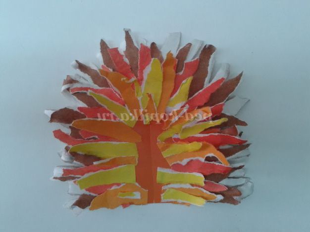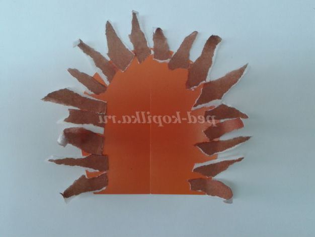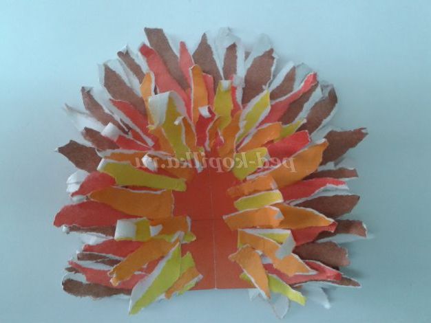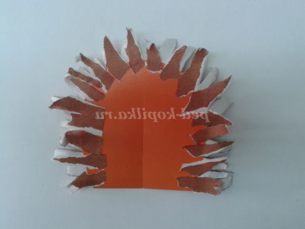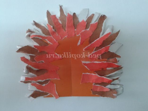 2. Потім з кольорового паперу способом обривання заготовимо смужки червоного, помаранчевого, жовтого і коричневого кольорів. Вони знадобляться для оформлення гриви лева.