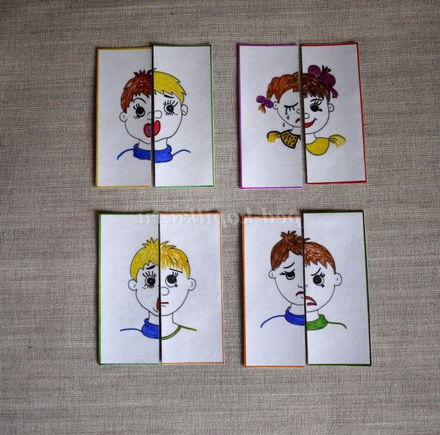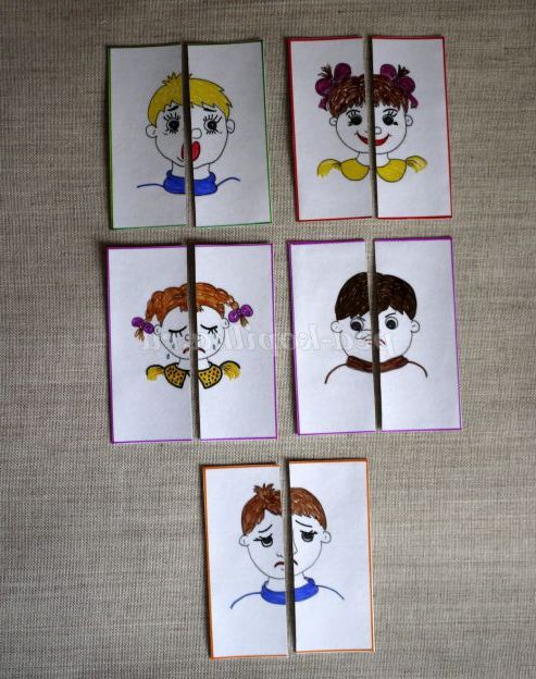 Набір карток рекомендований для роботи з дітьми шести років, розрізні картки-картинки із зображенням емоцій. Вони схожі на пазли. Кожне «обличчя» складається з двох частин, що відрізняються один від одного. Завдання дитини полягає в тому, щоб з'єднати їх правильно між собою і отримати певний вираз обличчя, адже це не так просто! Для кожної особи властиві певні вигини брів, губ, форма носа. Після того, як дитина успішно впоратися з поставленим перед ним завданням, можна обговорити ту чи іншу емоцію (в процесі виготовлення.