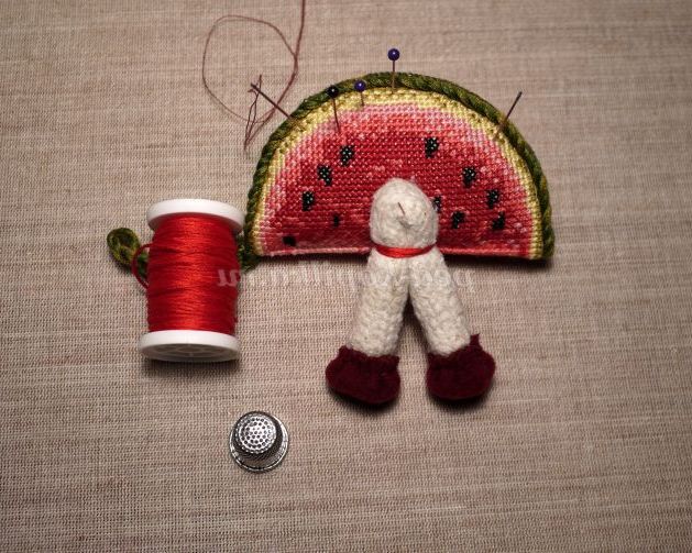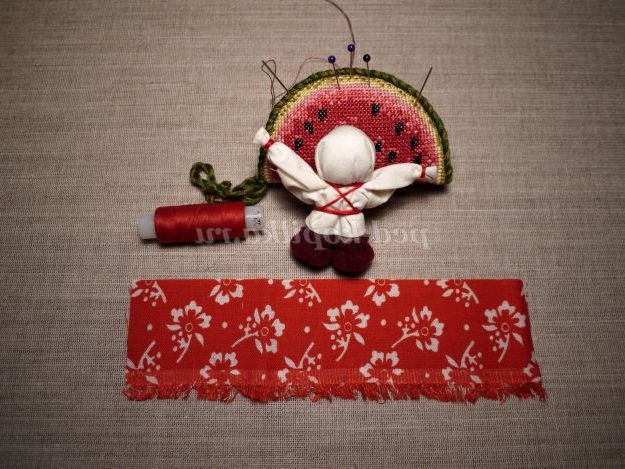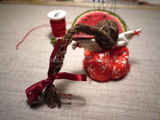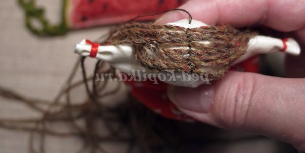 1. Беремо квадрат лляної (квадрат будь щільної бавовняної тканини) тканини і закручуємо в тугий джгут (по частковій нитці), зашиваємо відкритий край. Це будуть ніжки! Складаємо навпіл і обмотуємо червоною ниткою, закріплюємо.