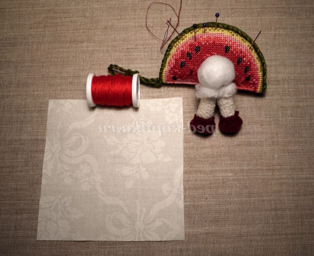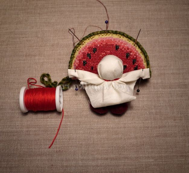 7. Інший світлий квадрат накладаємо на голову, складаємо по діагоналі. Зав'язуємо голову по шиї червоною ниткою.