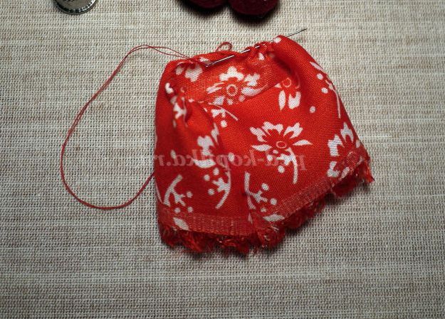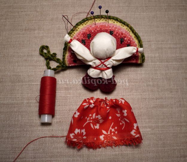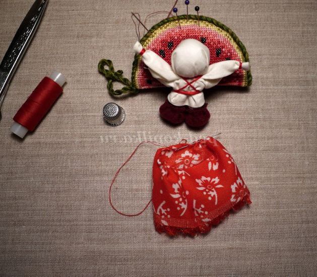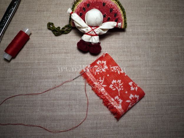 9. Тепер потрібно зробити наряд для нашої ляльки. Для вбрання підійдуть невеликі шматочки яскравих натуральних тканин. Можна зробити тільки спідничку, можна зробити сарафан. Адже сорочка у нашої ляльки вже є.
