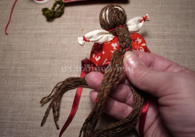 16. Прив'язуємо волосся червоною ниткою до шиї.