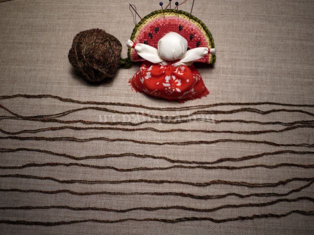 13. Нарізаємо з пряжі коричневого кольору пасма волосся (12 ниток по 45-50 см).