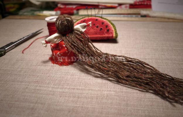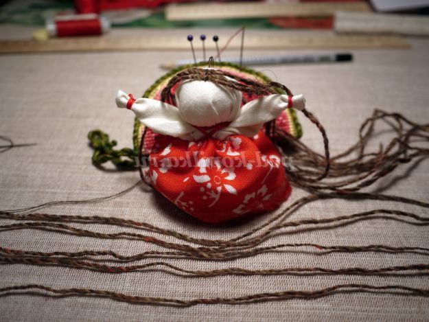 14. У традиційній «ляльці Щастя» головне - це волосся, в них жіноча сила. Вовняні (лляні) нитки прикладаємо до голови і пришиваємо по пробору. Пришиті волосся рівняємо по голові тому.