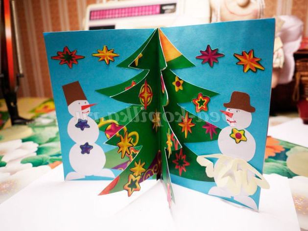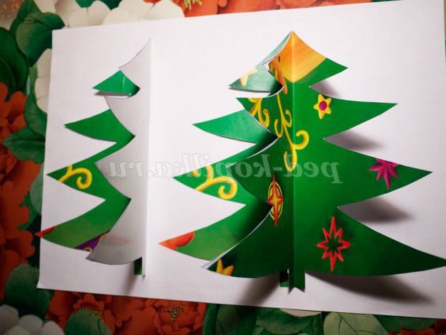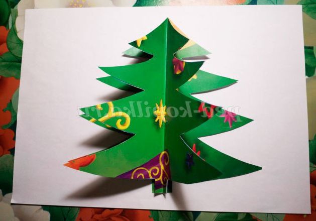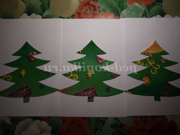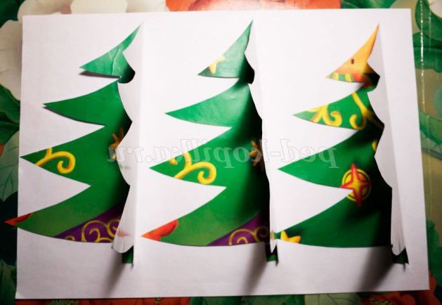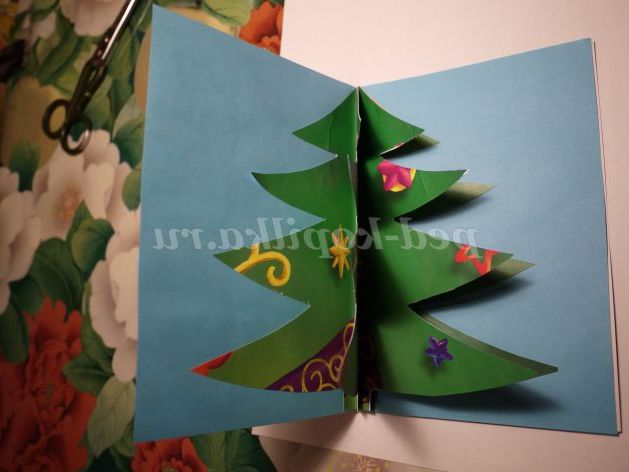 11. Потім на виворітну сторону готової ялинки наносимо клей, і приклеюємо її в середину внутрішньої частини листівки. Основна частина роботи виконана. Ось так виглядає Різдвяна листівка. Але її потрібно прикрасити!